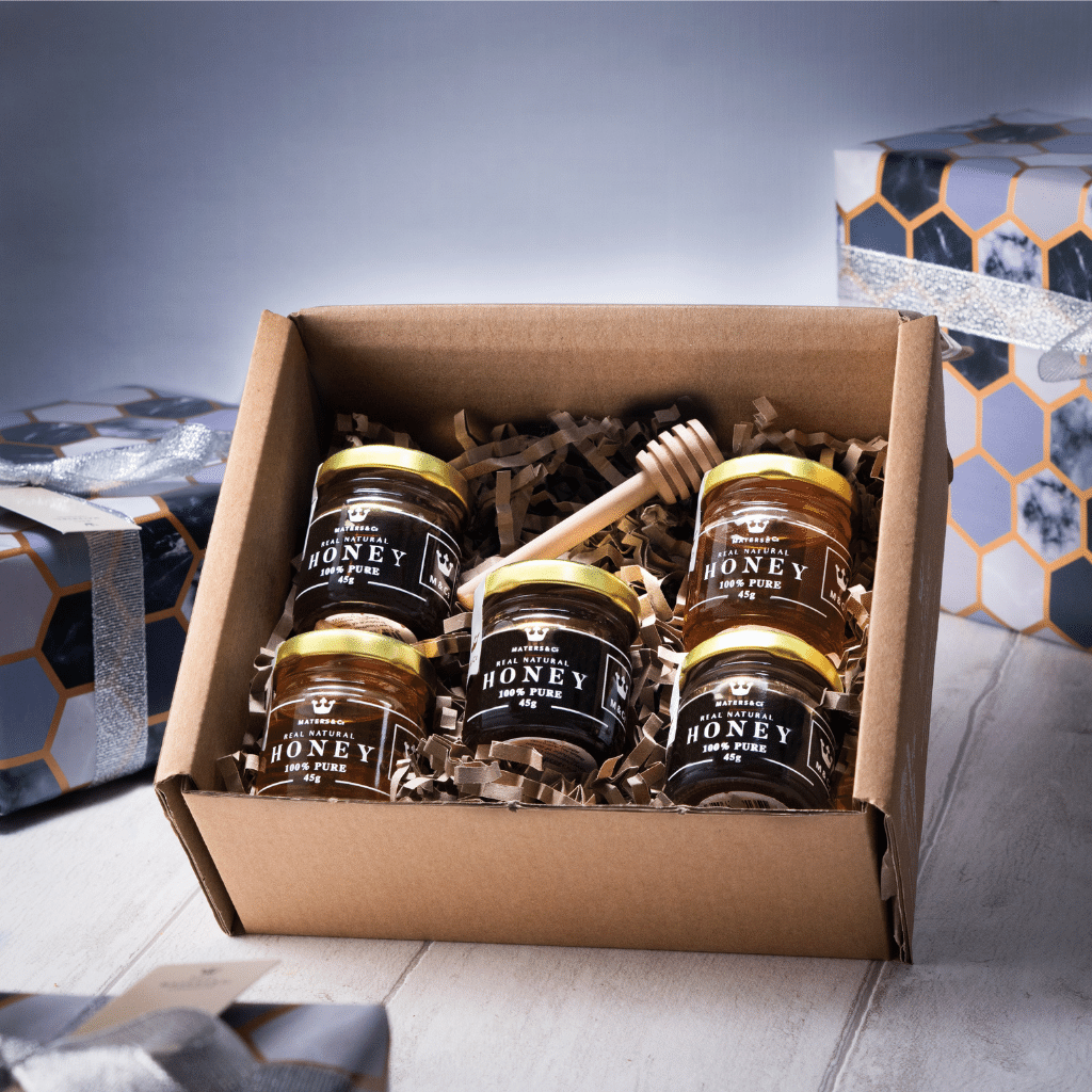 Strong Honey Taster Set - 5 Beautiful Sampler Jars & Mini Honey Dipper - Maters & Co
